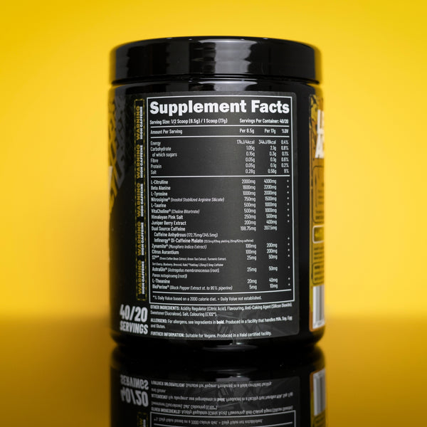 Each full scoop serving packs in a huge 400mg of caffeine, with 100% caffeine transparency on the sources. Alongside this LEGACY contains 400mg Juniper Berry Extract, 200mg Zynamite® and 200mg Citrus Aurantium providing over 1000mg of stimulants.