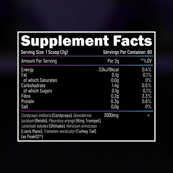 | Cordyceps militaris (Cordyceps), Ganoderma lucidum (Reishi), Pleurotus eryngii (King Trumpet), Lentinula edodes (Shiitake), Hericium erinaceus (Lion’s Mane), Trametes versicolor (Turkey Tail) (as PeakO2®) | 2g |